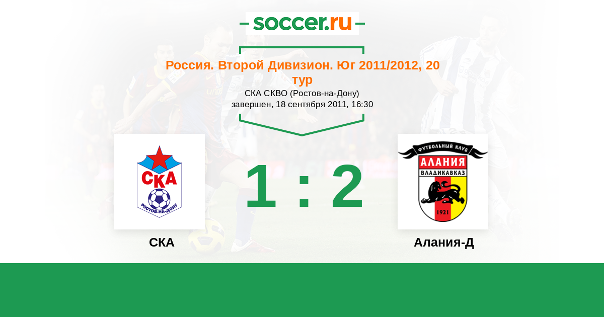 Россия. Вторая лига. Группа 1 16.07.2012 Алания-Д Логотип футбольный клуб Алания-Д (Владикавказ) 1:1 Логотип футбольный клуб СКА (Ростов-на-Дону) СКА