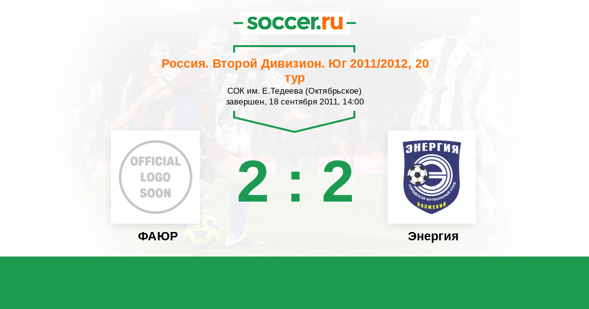 Россия. Вторая лига. Группа 1 18.09.2010 ФАЮР Логотип футбольный клуб ФАЮР (Беслан) 1:1 Логотип футбольный клуб Энергия (Волжский) Энергия