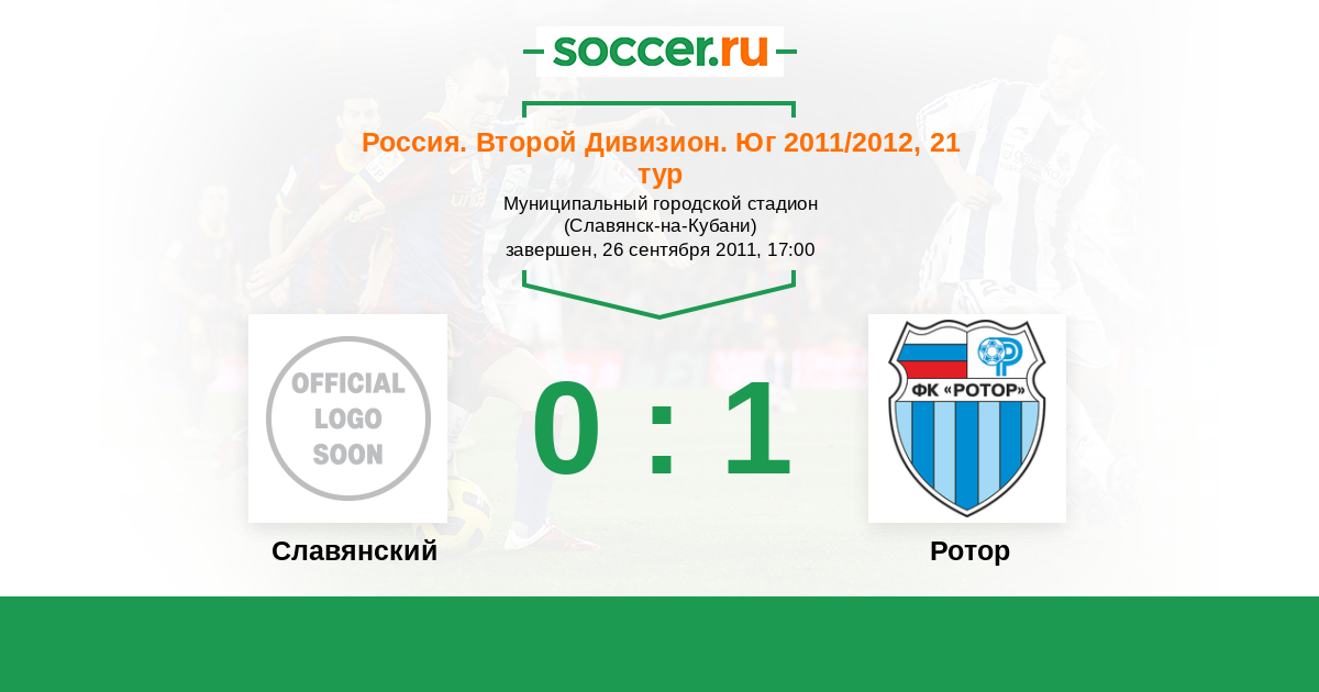 Россия. Вторая лига. Группа 1 19.05.2011 Ротор Логотип футбольный клуб Ротор (Волгоград) 1:1 Логотип футбольный клуб Славянский (Славянск-на-Кубани) Славянский