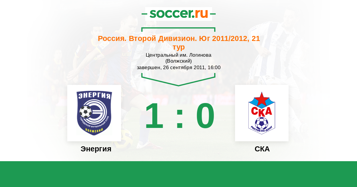 Россия. Вторая лига. Группа 1 11.10.2012 Энергия Логотип футбольный клуб Энергия (Волжский) 4:0 Логотип футбольный клуб СКА (Ростов-на-Дону) СКА