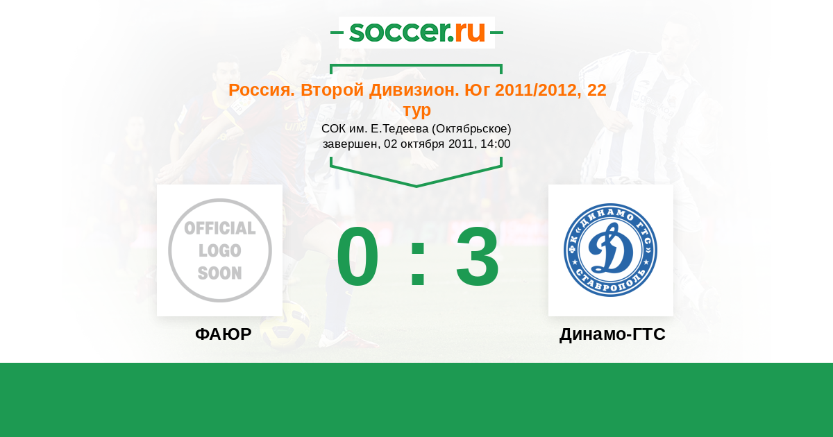 Россия. Вторая лига. Группа 1 07.05.2012 ФАЮР Логотип футбольный клуб ФАЮР (Беслан) 2:1 Логотип футбольный клуб Динамо Ставрополь Динамо Ставрополь