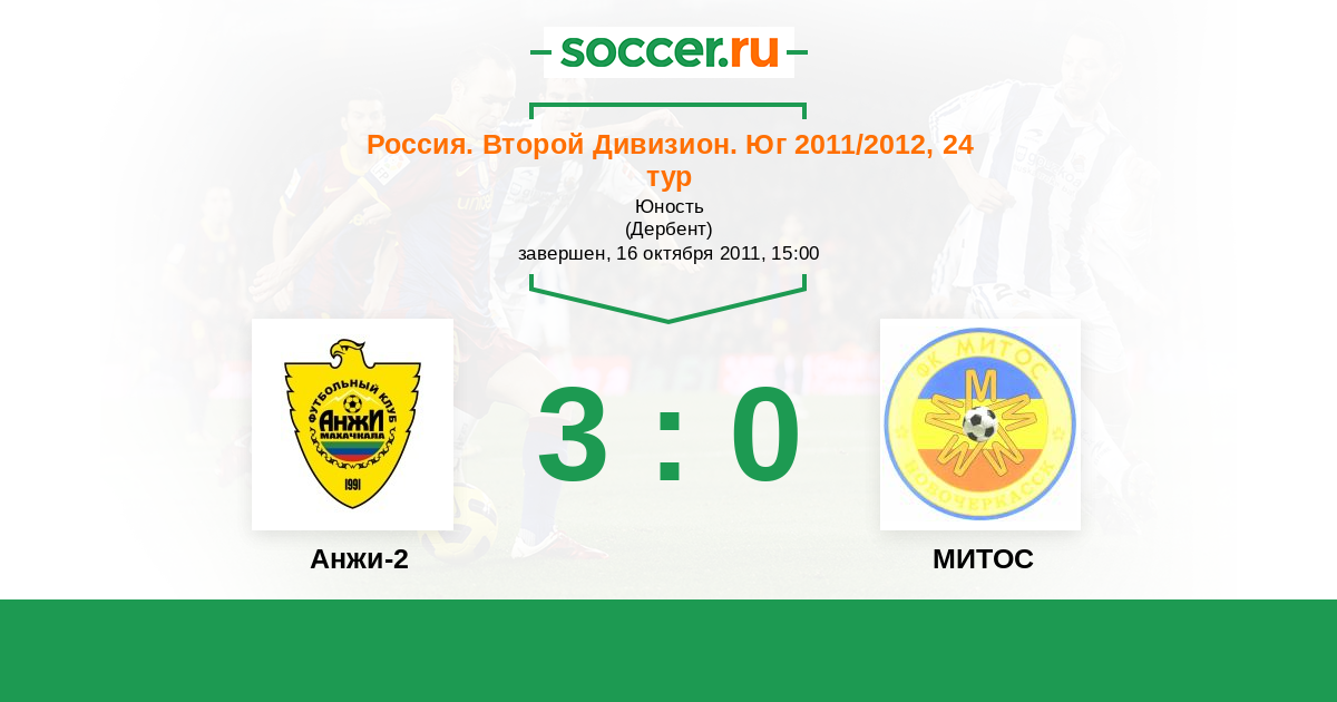 Россия. Вторая лига. Группа 1 19.09.2014 Анжи-2 Логотип футбольный клуб Анжи-2 (Махачкала) 0:1 Логотип футбольный клуб МИТОС (Новочеркасск) МИТОС