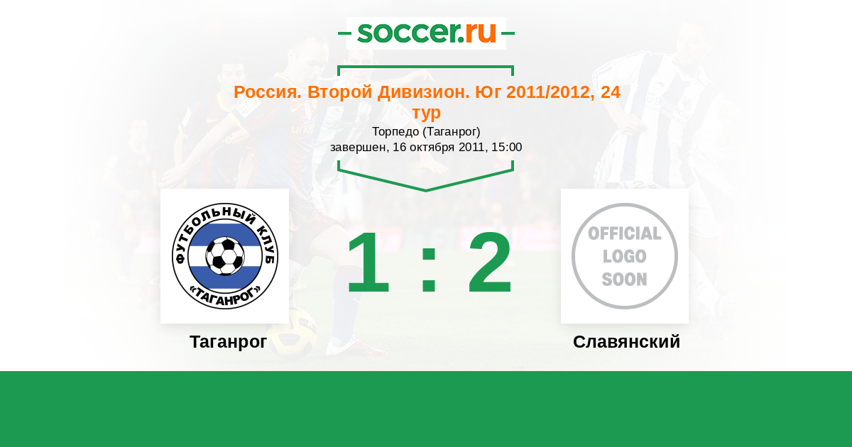 Россия. Вторая лига. Группа 1 12.06.2011 Славянский Логотип футбольный клуб Славянский (Славянск-на-Кубани) 2:1 Логотип футбольный клуб Таганрог Таганрог