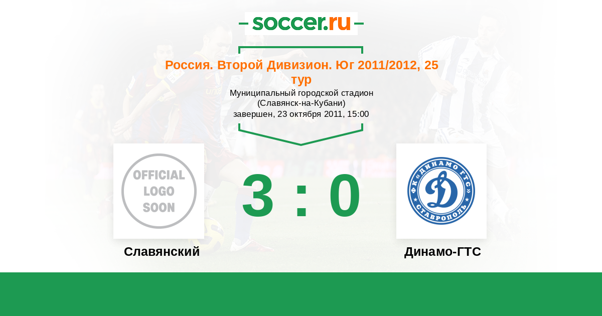 Россия. Вторая лига. Группа 1 21.06.2011 Кавказтрансгаз-2005 Логотип футбольный клуб Кавказтрансгаз-2005 (Ставрополь) 2:1 Логотип футбольный клуб Славянский (Славянск-на-Кубани) Славянский