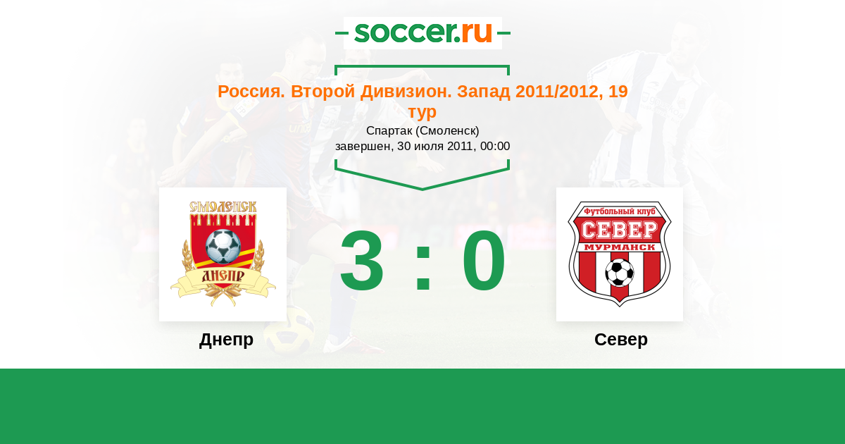 Россия. Вторая лига. Группа 2 30.04.2011 Север Логотип футбольный клуб Север (Мурманск) 0:3 Логотип футбольный клуб Днепр (Смоленск) Днепр