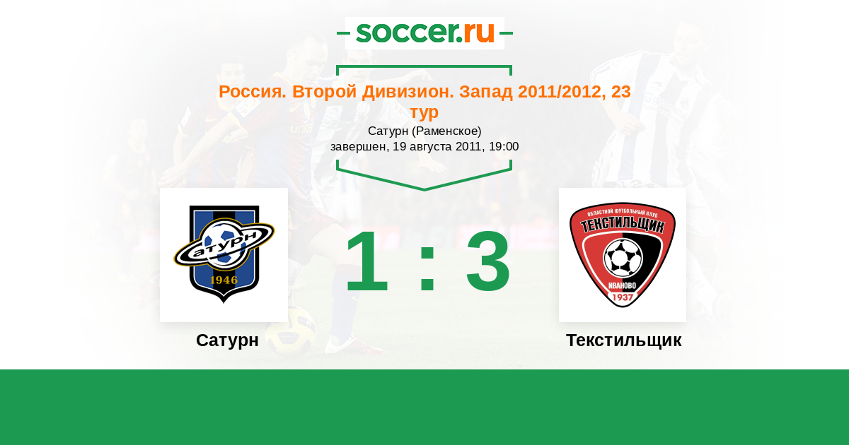 Россия. Вторая лига. Группа 2 22.08.2014 Сатурн Логотип футбольный клуб Сатурн (Раменское) 1:0 Логотип футбольный клуб Текстильщик (Иваново) Текстильщик