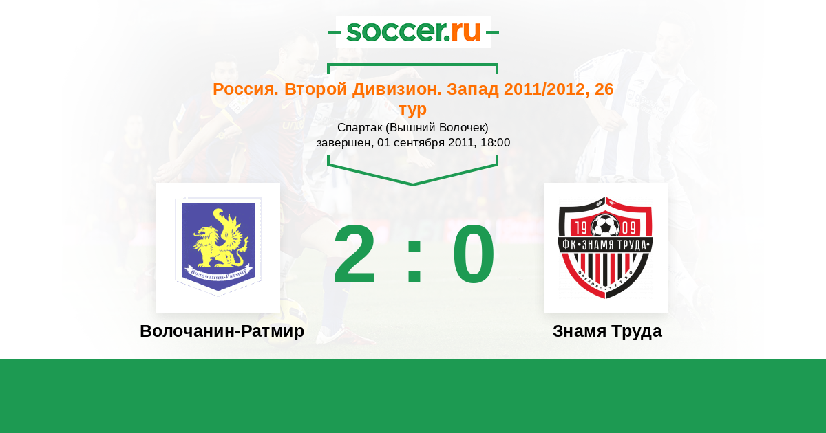 Россия. Вторая лига. Группа 2 03.06.2011 Знамя Труда Логотип футбольный клуб Знамя Труда (Орехово-Зуево) 0:3 Логотип футбольный клуб Волочанин-Ратмир (Вышний Волочек) Волочанин-Ратмир