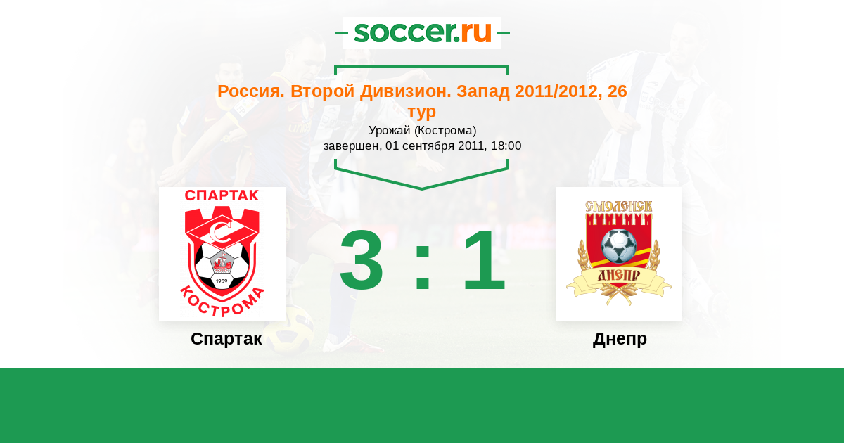 Россия. Вторая лига. Группа 2 03.06.2011 Днепр Логотип футбольный клуб Днепр (Смоленск) 2:1 Логотип футбольный клуб Спартак Кострома Спартак Кострома