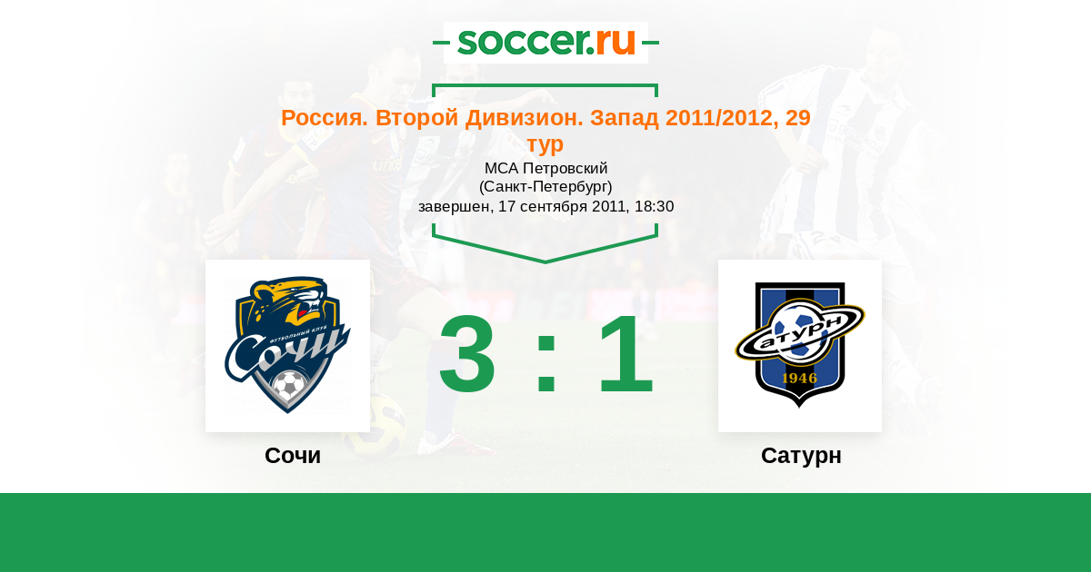 Россия. Вторая лига. Группа 2 20.06.2011 Сатурн Логотип футбольный клуб Сатурн (Раменское) 0:2 Логотип футбольный клуб Петротрест (Сочи) Петротрест