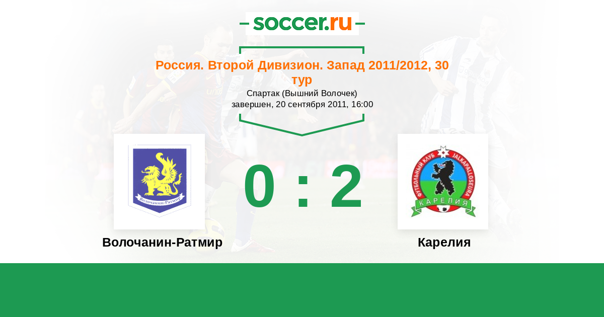 Россия. Вторая лига. Группа 2 23.06.2011 Карелия Логотип футбольный клуб Карелия (Петрозаводск) 3:2 Логотип футбольный клуб Волочанин-Ратмир (Вышний Волочек) Волочанин-Ратмир