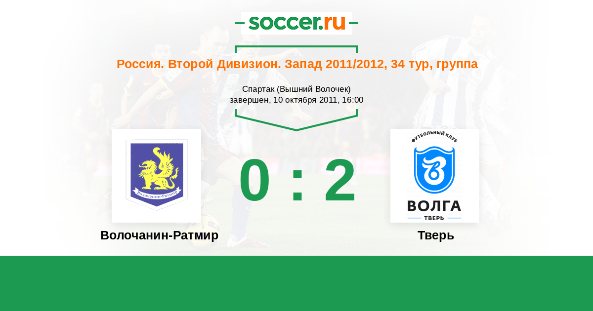 Россия. Вторая лига. Группа 2 14.07.2011 Тверь Логотип футбольный клуб Тверь 2:1 Логотип футбольный клуб Волочанин-Ратмир (Вышний Волочек) Волочанин-Ратмир