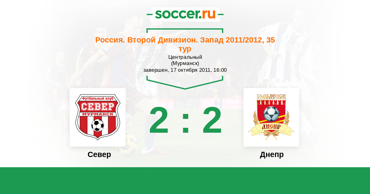 Россия. Вторая лига. Группа 2 17.08.2012 Днепр Логотип футбольный клуб Днепр (Смоленск) 1:1 Логотип футбольный клуб Север (Мурманск) Север