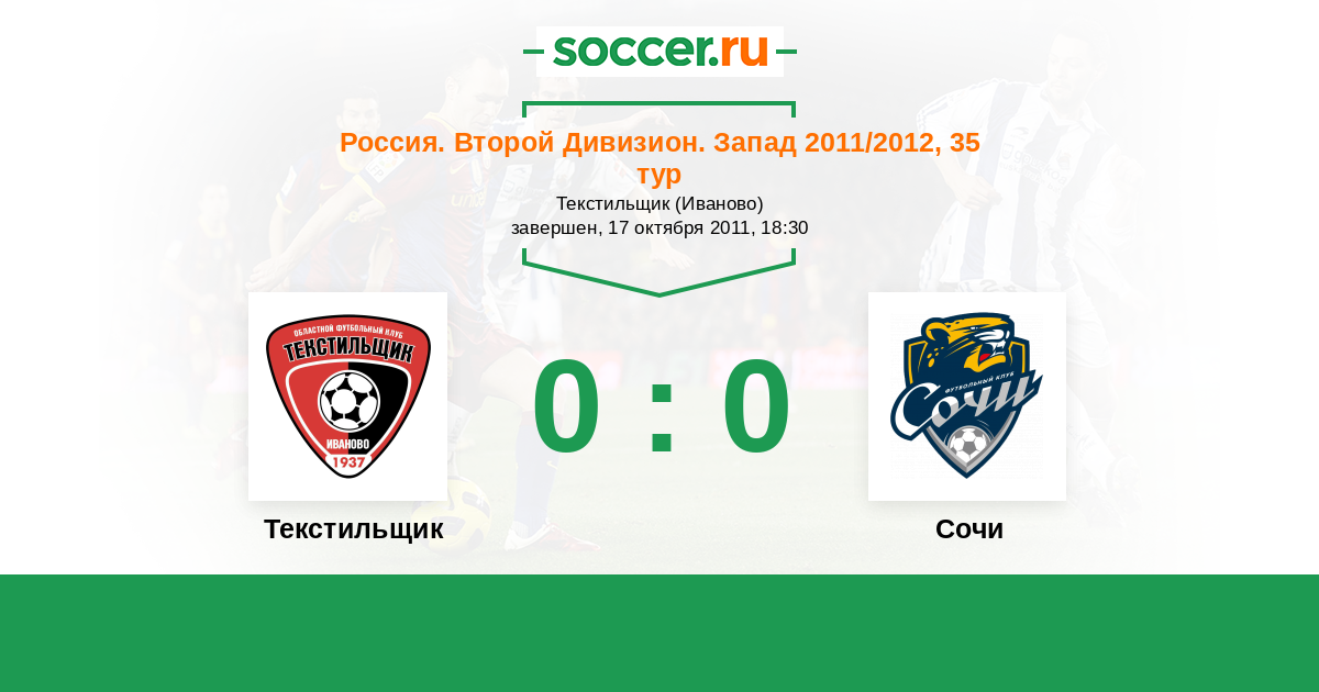 Россия. Вторая лига. Группа 2 30.07.2011 Петротрест Логотип футбольный клуб Петротрест (Сочи) 0:0 Логотип футбольный клуб Текстильщик (Иваново) Текстильщик