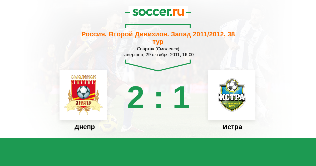 Россия. Вторая лига. Группа 2 29.09.2010 Истра Логотип футбольный клуб Истра 3:0 Логотип футбольный клуб Днепр (Смоленск) Днепр
