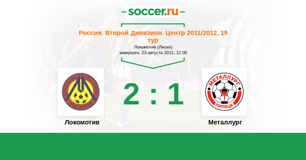 Россия. Вторая лига. Группа 3 29.04.2012 Металлург Логотип футбольный клуб Металлург (Липецк) 0:2 Логотип футбольный клуб Локомотив (Лиски) Локомотив