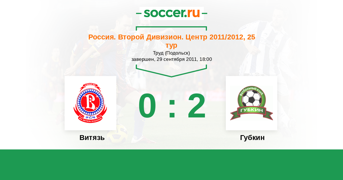 Россия. Вторая лига. Группа 3 04.06.2012 Губкин Логотип футбольный клуб Губкин 2:0 Логотип футбольный клуб Витязь (Подольск) Витязь