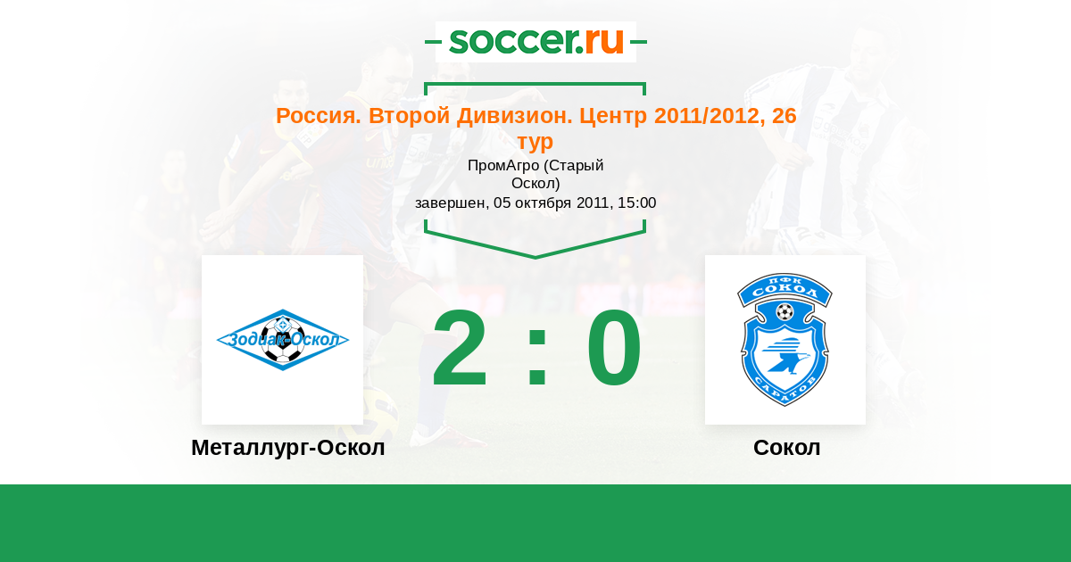 Россия. Вторая лига. Группа 3 11.10.2011 Сокол Логотип футбольный клуб Сокол (Саратов) 2:0 Логотип футбольный клуб Металлург-Оскол (Старый Оскол) Металлург-Оскол