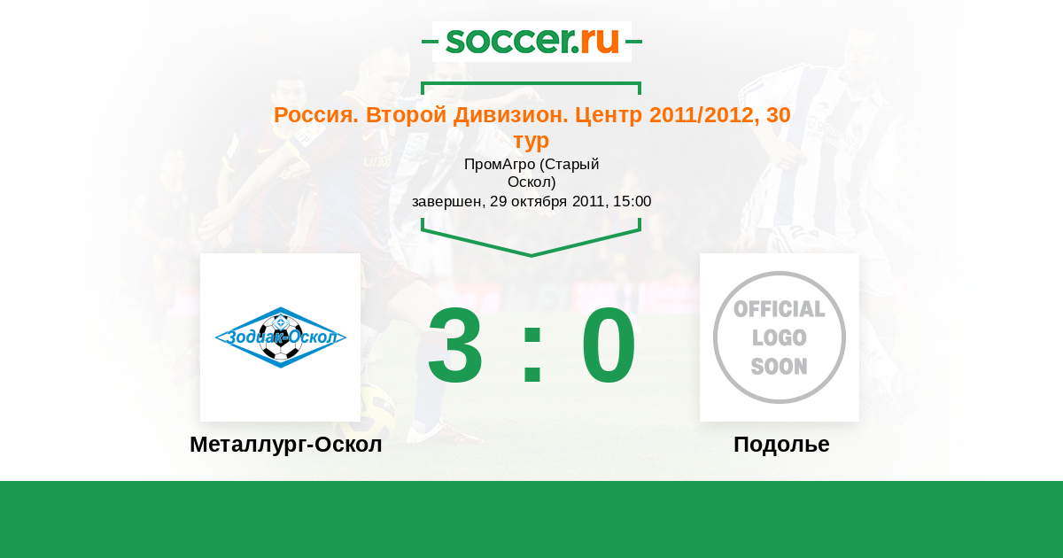 Россия. Вторая лига. Группа 3 05.08.2011 Подолье Логотип футбольный клуб Подолье (Подольский район) 1:2 Логотип футбольный клуб Металлург-Оскол (Старый Оскол) Металлург-Оскол