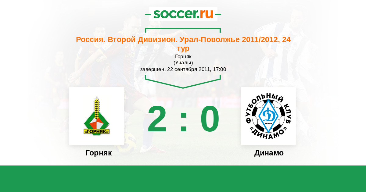 Россия. Вторая лига. Группа 4 30.05.2012 Динамо Киров Логотип футбольный клуб Динамо Киров 2:1 Логотип футбольный клуб Горняк (Учалы) Горняк