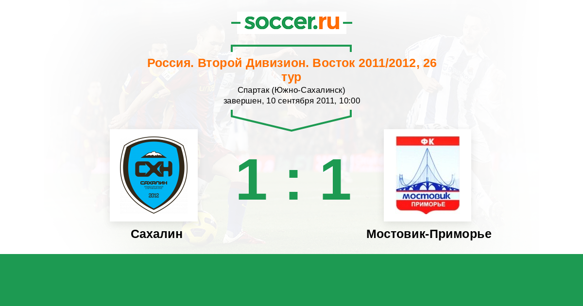 Россия. 2-й дивизион. Восток 11.10.2011 Мостовик-Приморье Логотип футбольный клуб Мостовик-Приморье (Уссурийск) 3:0 Логотип футбольный клуб Сахалин (Южно-Сахалинск) Сахалин