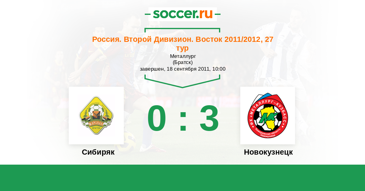 Россия. 2-й дивизион. Восток 28.09.2011 Металлург-Кузбасс Логотип футбольный клуб Металлург-Кузбасс (Новокузнецк) 2:1 Логотип футбольный клуб Сибиряк (Братск) Сибиряк