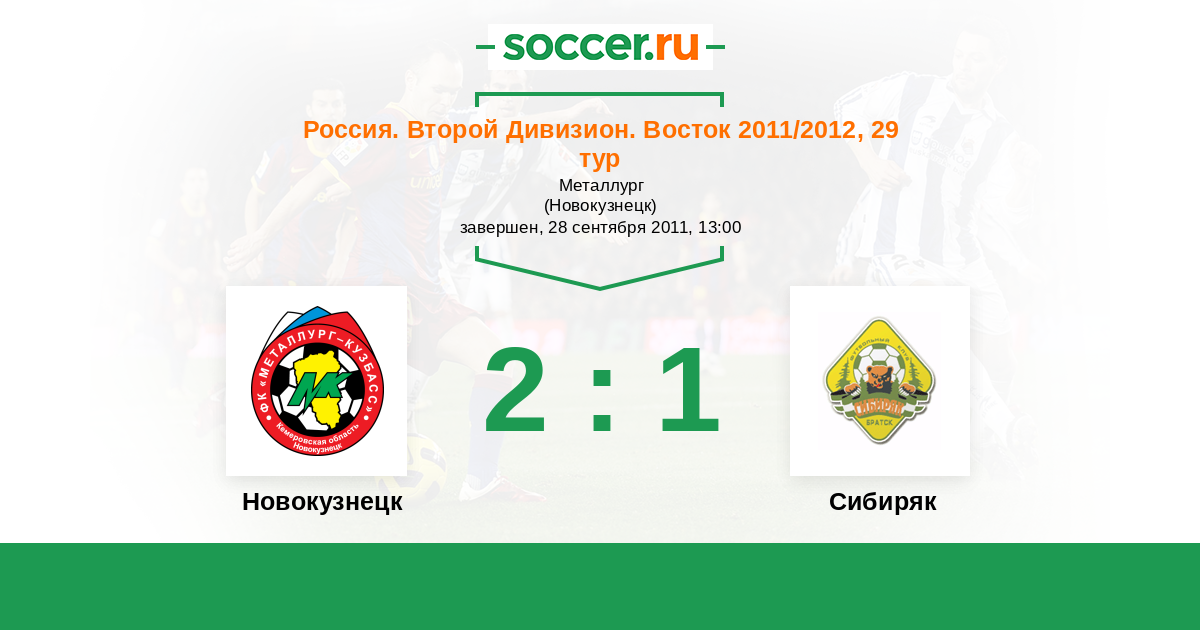 Россия. 2-й дивизион. Восток 18.09.2011 Сибиряк Логотип футбольный клуб Сибиряк (Братск) 0:3 Логотип футбольный клуб Металлург-Кузбасс (Новокузнецк) Металлург-Кузбасс