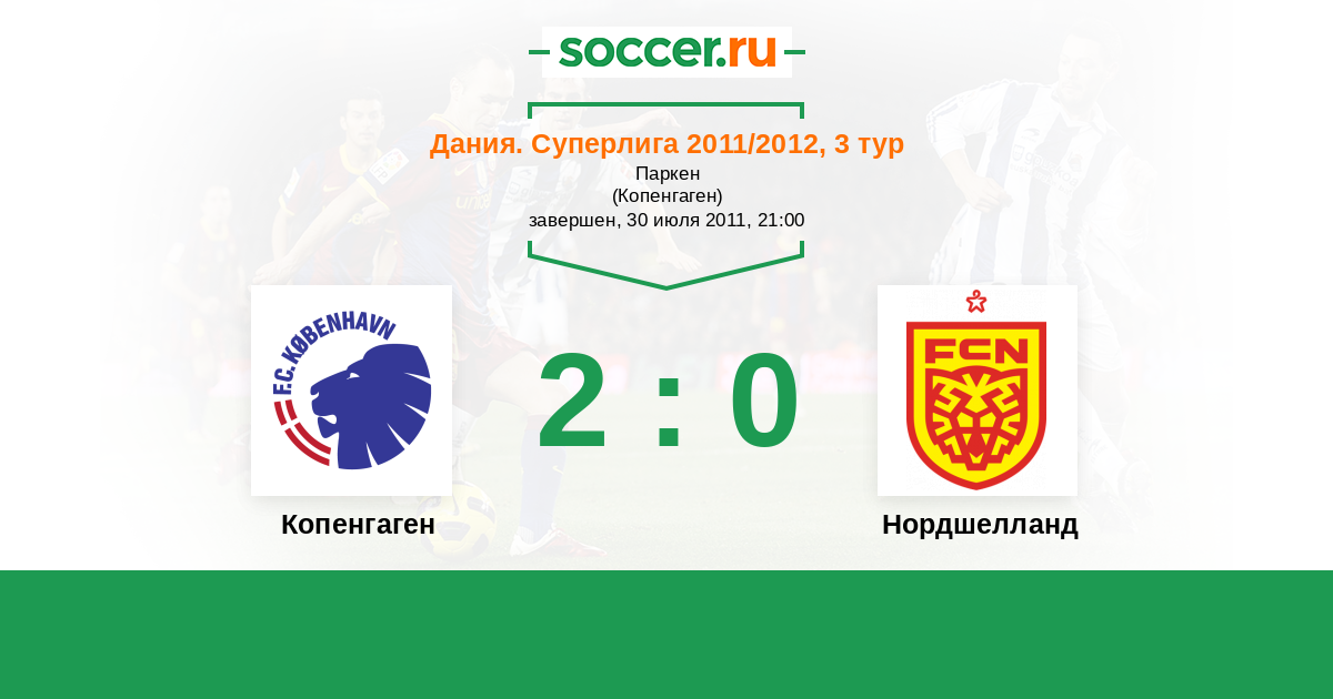 Дания. Суперлига 02.05.2012 Нордшелланд Логотип футбольный клуб Нордшелланд (Фарум) 1:0 Логотип футбольный клуб Копенгаген Копенгаген