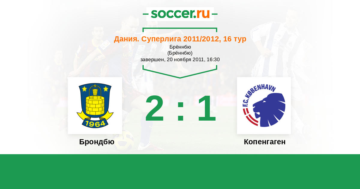 Дания. Суперлига 24.09.2011 Брондбю Логотип футбольный клуб Брондбю (Брённбю) 1:2 Логотип футбольный клуб Копенгаген Копенгаген