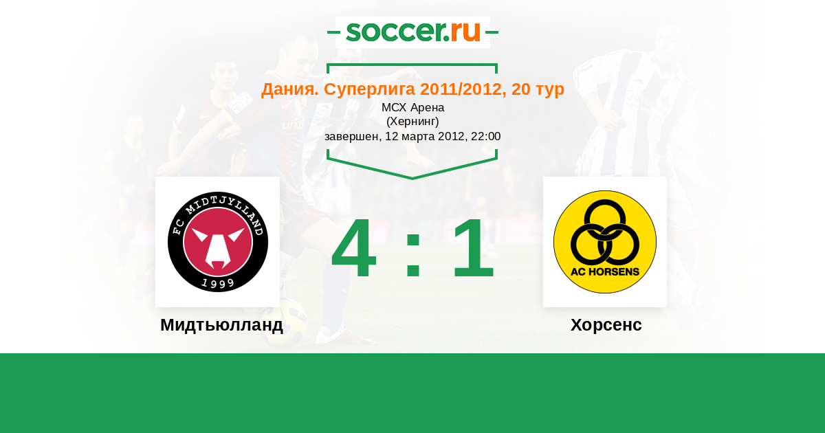 Дания. Суперлига 03.10.2011 Мидтьюлланд Логотип футбольный клуб Мидтьюлланд (Хернинг) 1:0 Логотип футбольный клуб Хорсенс Хорсенс