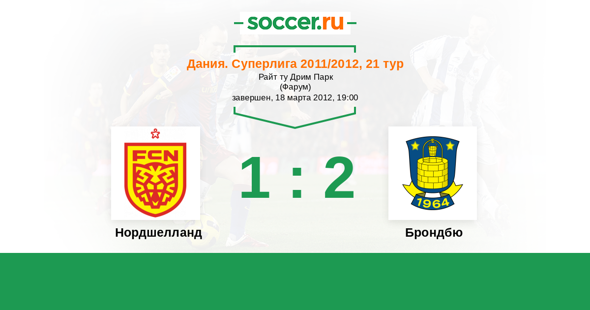 Дания. Суперлига 02.12.2012 Нордшелланд Логотип футбольный клуб Нордшелланд (Фарум) 3:0 Логотип футбольный клуб Брондбю (Брённбю) Брондбю