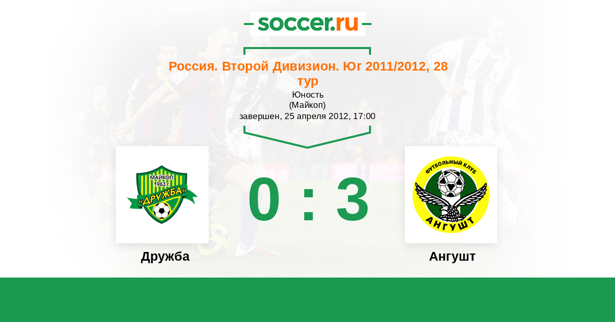 Россия. Вторая лига. Группа 1 13.07.2011 Ангушт Логотип футбольный клуб Ангушт (Назрань) 3:2 Логотип футбольный клуб Дружба (Майкоп) Дружба