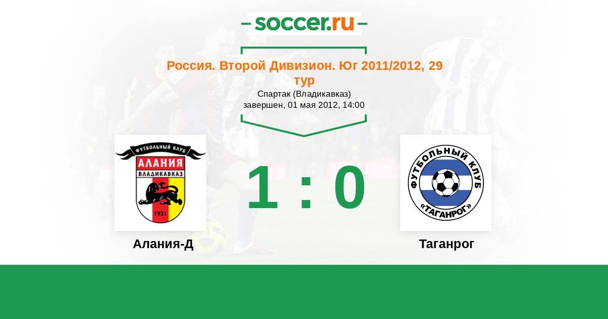 Россия. Вторая лига. Группа 1 09.08.2012 Алания-Д Логотип футбольный клуб Алания-Д (Владикавказ) 0:2 Логотип футбольный клуб Таганрог Таганрог