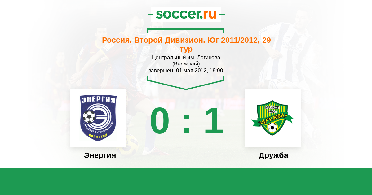 Россия. Вторая лига. Группа 1 20.07.2011 Дружба Логотип футбольный клуб Дружба (Майкоп) 4:1 Логотип футбольный клуб Энергия (Волжский) Энергия