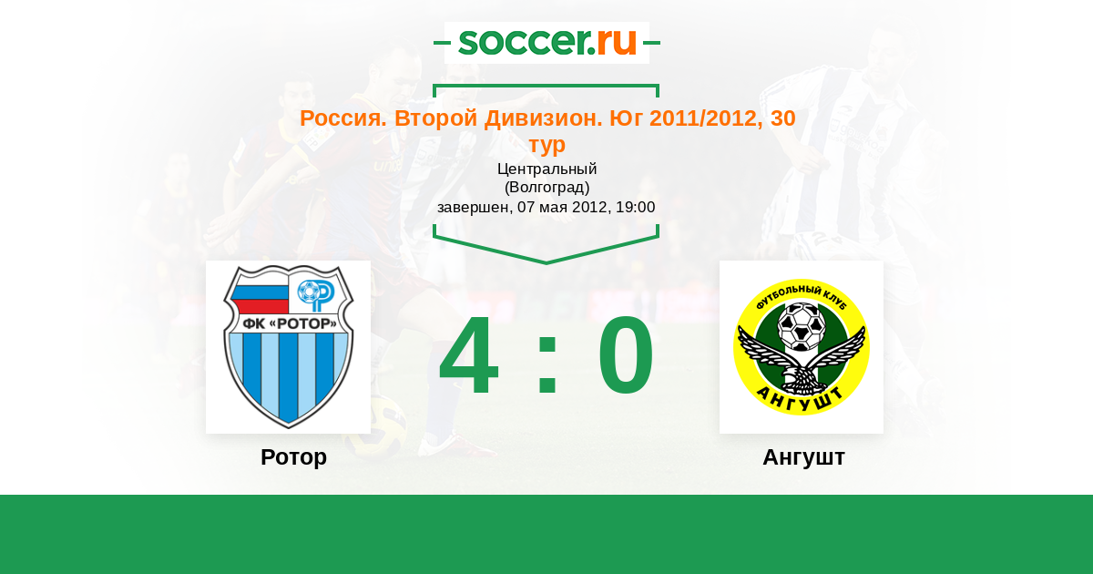 Россия. Вторая лига. Группа 1 07.08.2011 Ангушт Логотип футбольный клуб Ангушт (Назрань) 1:0 Логотип футбольный клуб Ротор (Волгоград) Ротор