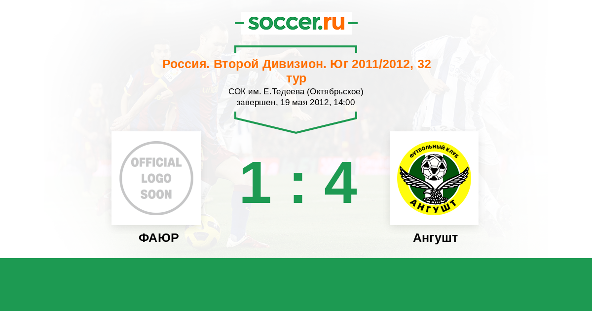 Россия. Вторая лига. Группа 1 19.05.2012 ФАЮР Логотип футбольный клуб ФАЮР (Беслан) 1:4 Логотип футбольный клуб Ангушт (Назрань) Ангушт