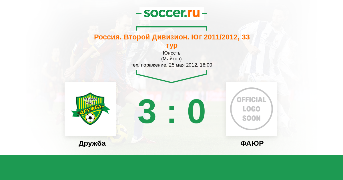 Россия. Вторая лига. Группа 1 25.05.2012 Дружба Логотип футбольный клуб Дружба (Майкоп) 3:0 Логотип футбольный клуб ФАЮР (Беслан) ФАЮР