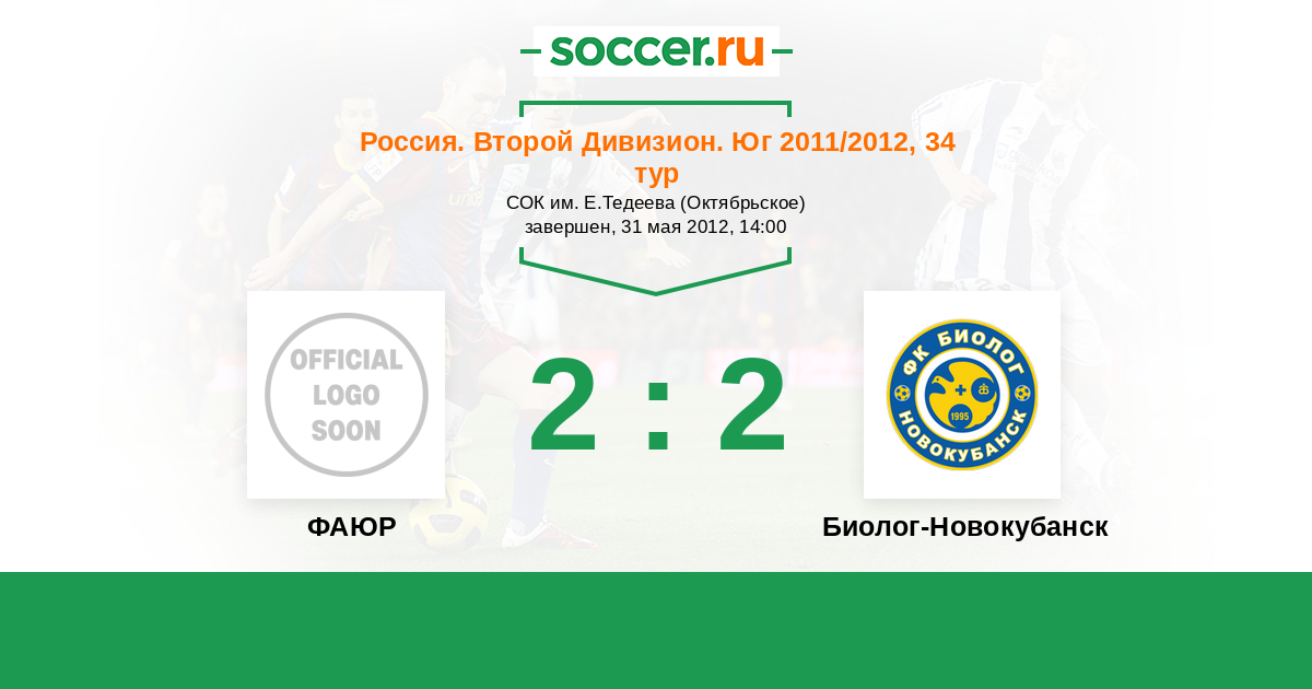 Россия. Вторая лига. Группа 1 31.05.2012 ФАЮР Логотип футбольный клуб ФАЮР (Беслан) 2:2 Логотип футбольный клуб Биолог-Новокубанск Биолог-Новокубанск