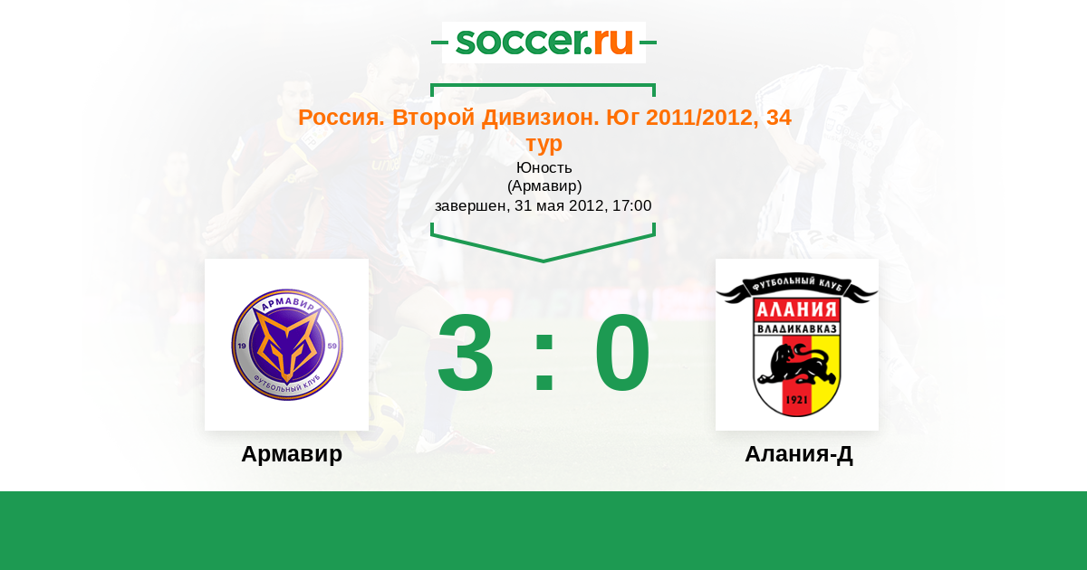 Россия. Вторая лига. Группа 1 16.05.2011 Алания-Д Логотип футбольный клуб Алания-Д (Владикавказ) 1:2 Логотип футбольный клуб Торпедо Армавир Торпедо Армавир