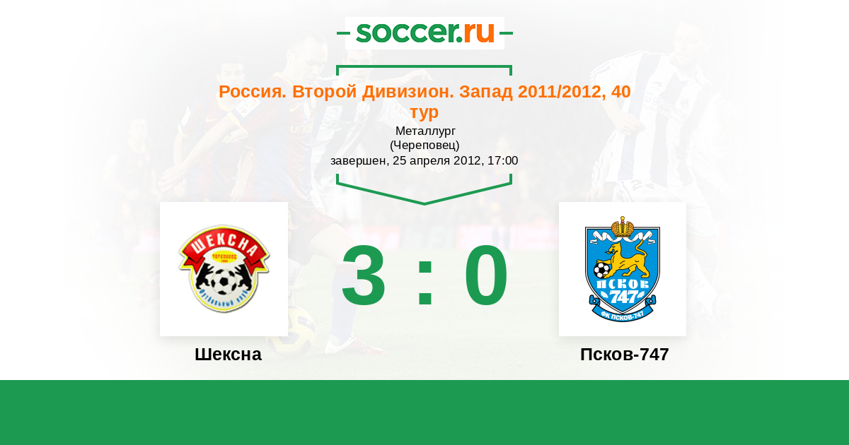 Россия. Вторая лига. Группа 2 24.05.2011 Шексна Логотип футбольный клуб Шексна (Череповец) 0:2 Логотип футбольный клуб Псков-747 Псков-747