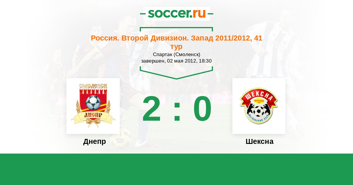 Россия. Вторая лига. Группа 2 02.05.2012 Днепр Логотип футбольный клуб Днепр (Смоленск) 2:0 Логотип футбольный клуб Шексна (Череповец) Шексна