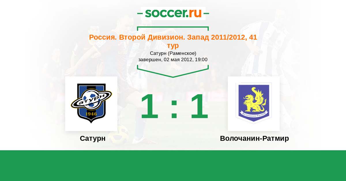 Россия. Вторая лига. Группа 2 29.08.2011 Волочанин-Ратмир Логотип футбольный клуб Волочанин-Ратмир (Вышний Волочек) 1:1 Логотип футбольный клуб Сатурн (Раменское) Сатурн