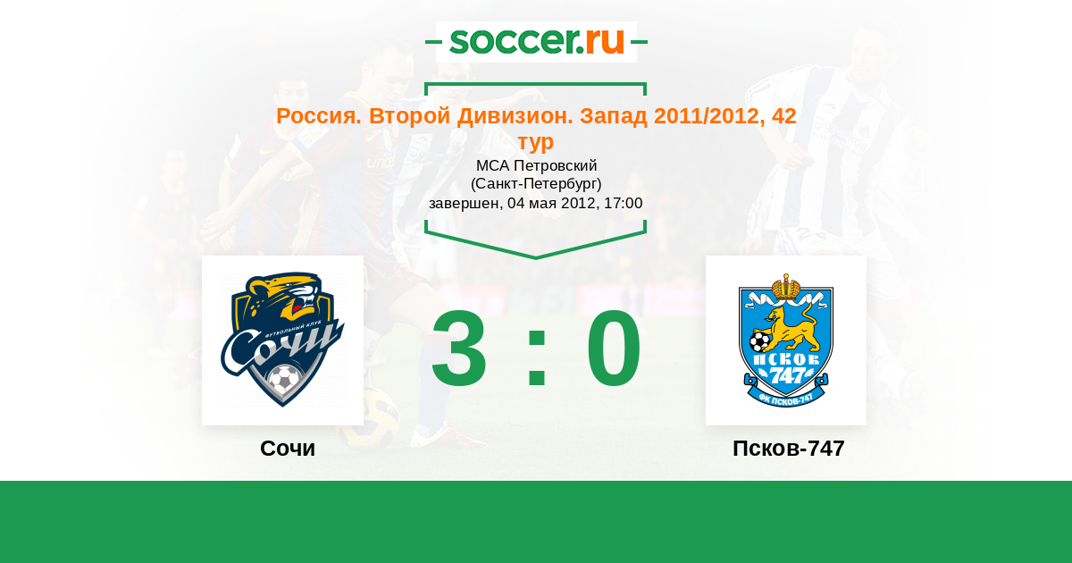 Россия. Вторая лига. Группа 2 03.06.2011 Петротрест Логотип футбольный клуб Петротрест (Сочи) 0:0 Логотип футбольный клуб Псков-747 Псков-747