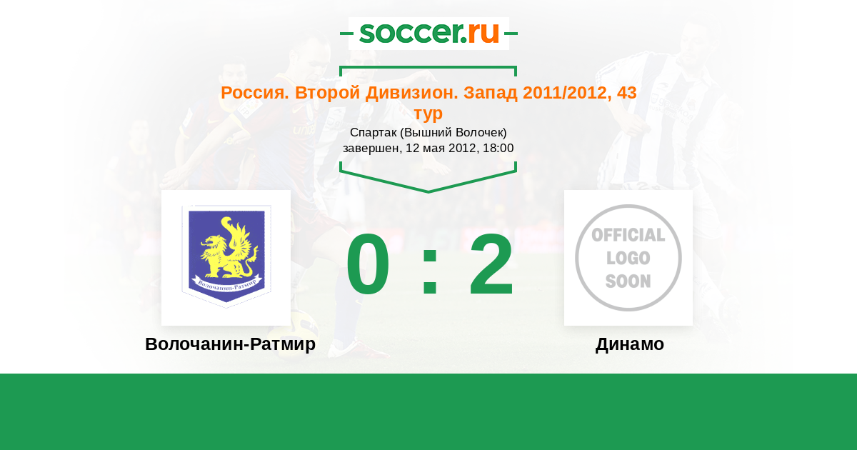 Россия. Вторая лига. Группа 2 12.05.2012 Волочанин-Ратмир Логотип футбольный клуб Волочанин-Ратмир (Вышний Волочек) 0:2 Логотип футбольный клуб Динамо (Кострома) Динамо