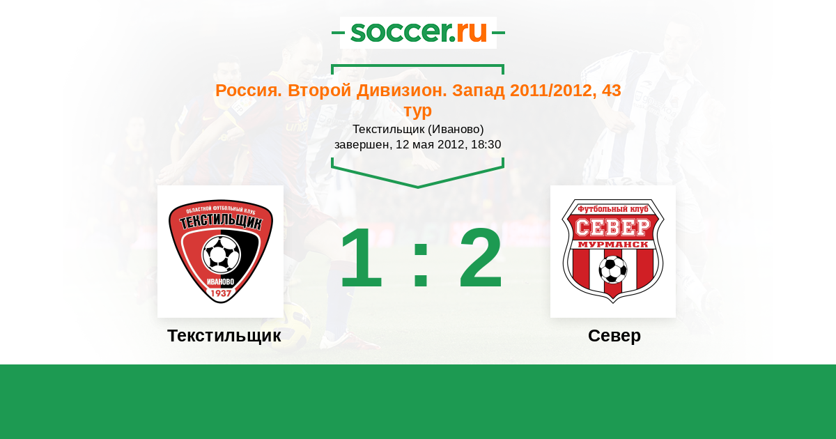 Россия. Вторая лига. Группа 2 30.09.2012 Север Логотип футбольный клуб Север (Мурманск) 0:0 Логотип футбольный клуб Текстильщик (Иваново) Текстильщик