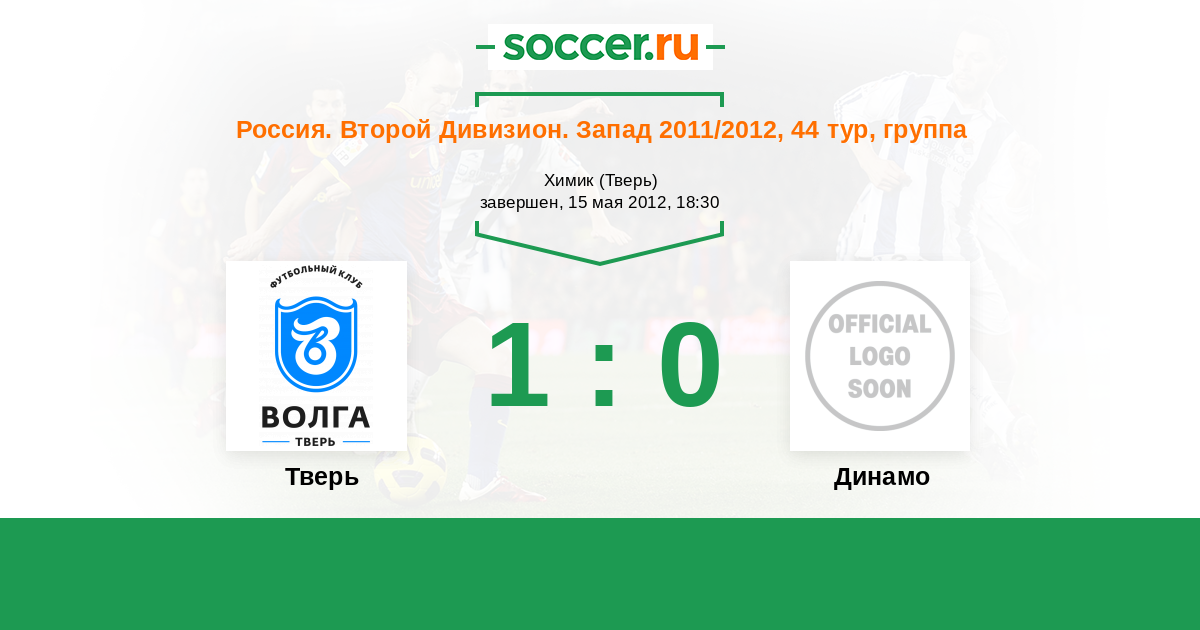 Россия. Вторая лига. Группа 2 15.05.2012 Тверь Логотип футбольный клуб Тверь 1:0 Логотип футбольный клуб Динамо (Кострома) Динамо