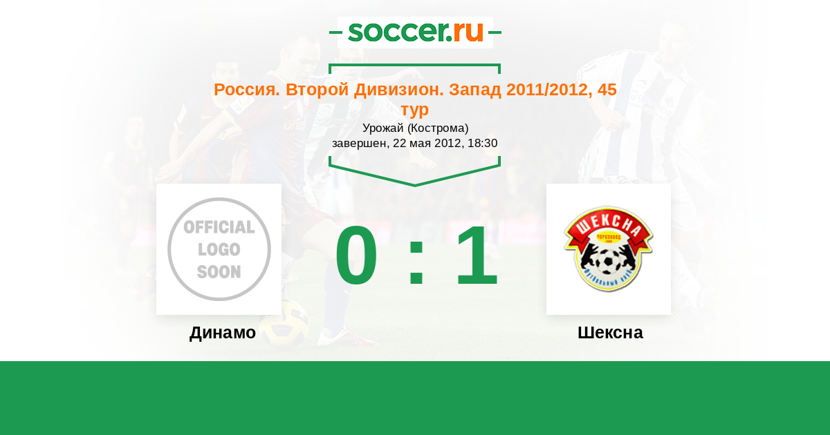 Россия. Вторая лига. Группа 2 22.05.2012 Динамо Логотип футбольный клуб Динамо (Кострома) 0:1 Логотип футбольный клуб Шексна (Череповец) Шексна