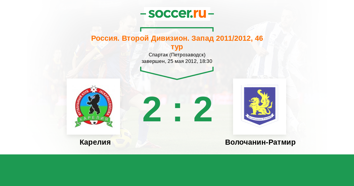 Россия. Вторая лига. Группа 2 25.05.2012 Карелия Логотип футбольный клуб Карелия (Петрозаводск) 2:2 Логотип футбольный клуб Волочанин-Ратмир (Вышний Волочек) Волочанин-Ратмир