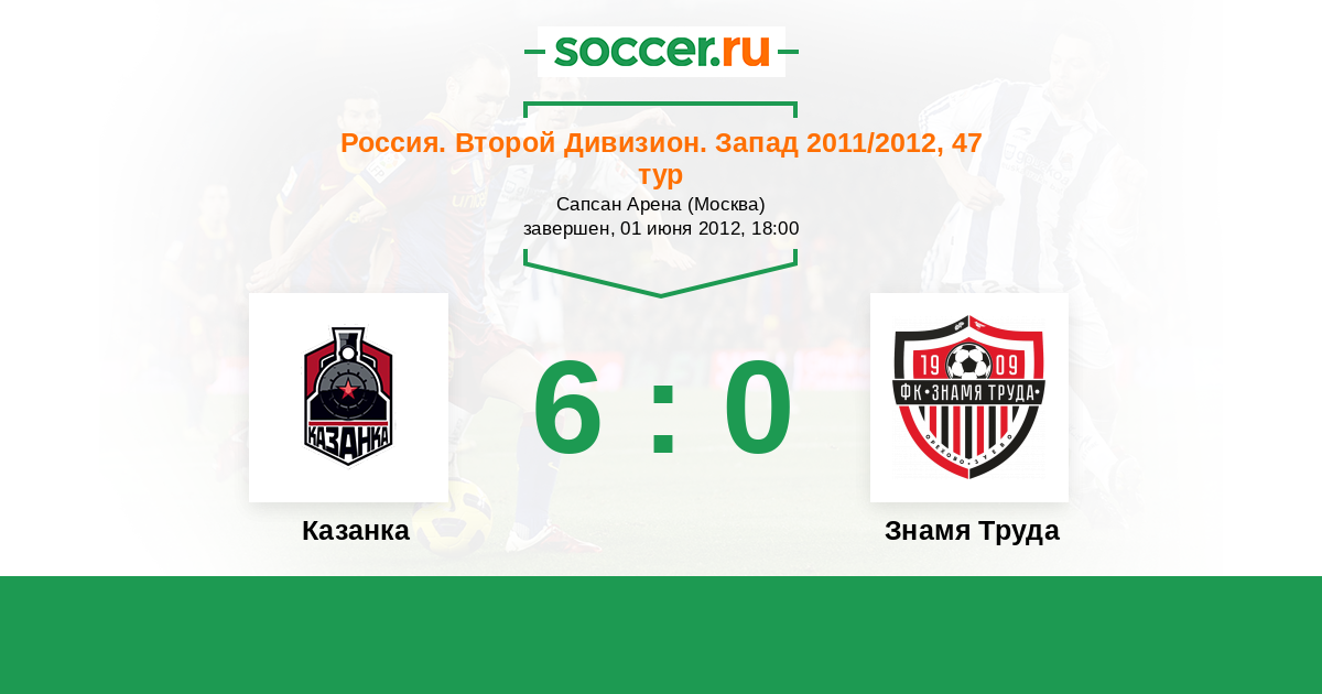 Россия. Вторая лига. Группа 2 27.05.2018 Казанка Логотип футбольный клуб Казанка (Москва) 2:1 Логотип футбольный клуб Знамя Труда (Орехово-Зуево) Знамя Труда