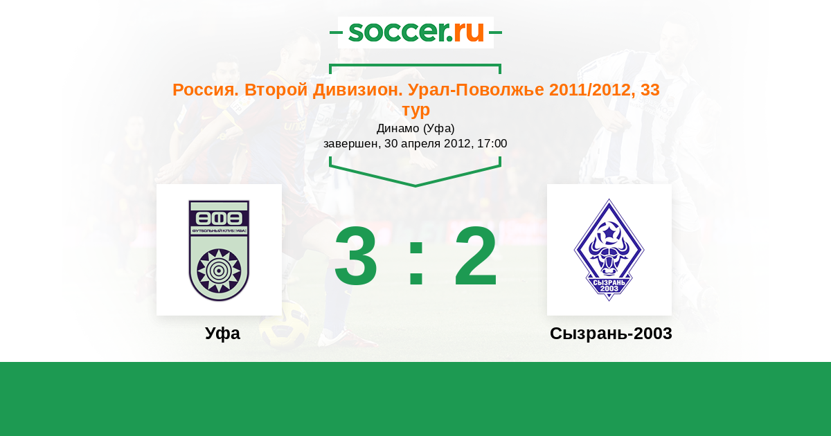 Россия. Вторая лига. Группа 4 30.05.2011 Уфа Логотип футбольный клуб Уфа 0:0 Логотип футбольный клуб Сызрань-2003 Сызрань-2003