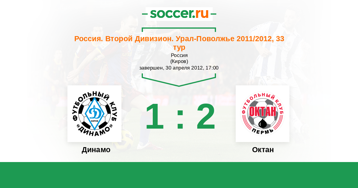 Россия. Вторая лига. Группа 4 19.09.2012 Октан Логотип футбольный клуб Октан (Пермь) 0:2 Логотип футбольный клуб Динамо Киров Динамо Киров